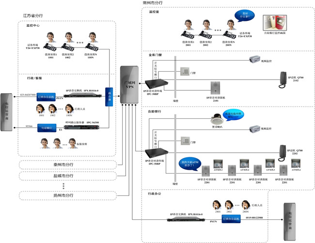 對講服務(wù)器通過語音中繼與電話銀行以及行政辦公電話系統(tǒng)融為一體。